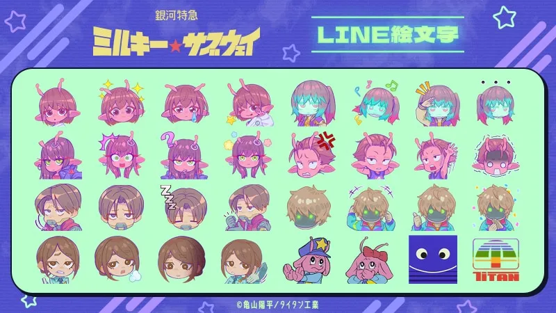 LINE emojis from the anime "Galaxy Express Milky Subway" are on sale for 100 LINE coins at the stamp shop and 250 yen at the LINE STORE.
